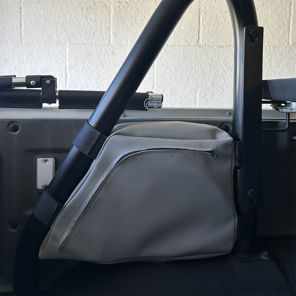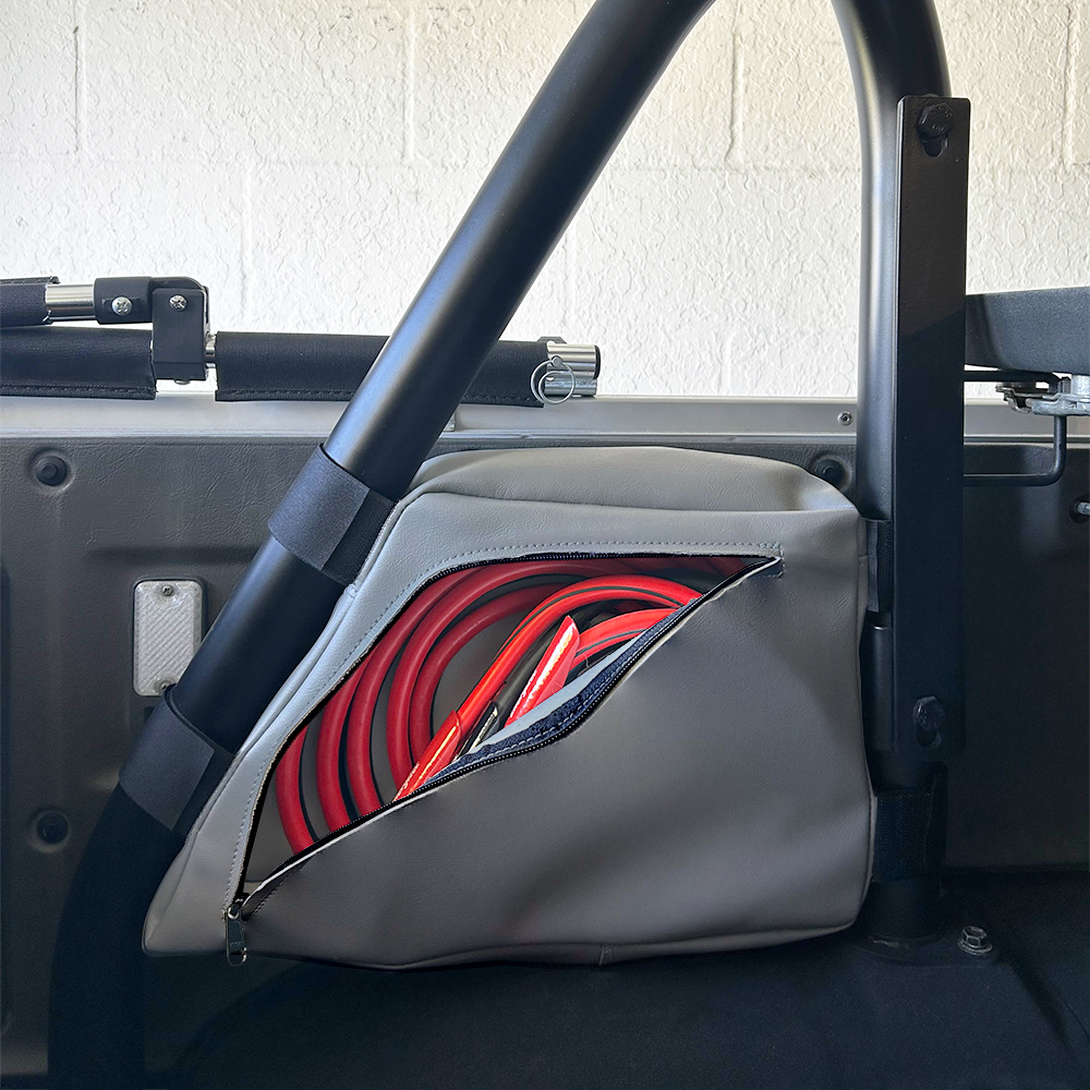Need extra storage for tools, jumper cables, or camping gear? Proudly made in the USA, this pair of perfectly sized roll bar cargo bags combines durability, style, and functionality. Crafted from high-quality thick vinyl with a sturdy YKK zipper, these bags seamlessly blend with your vehicle’s OEM look. Installation is quick and hassle-free—each bag securely attaches to the roll bar with four Velcro straps for a stable fit that stays in place yet allows for easy removal. Each set includes two roll bar storage bags: one for the driver’s side and one for the passenger’s side.